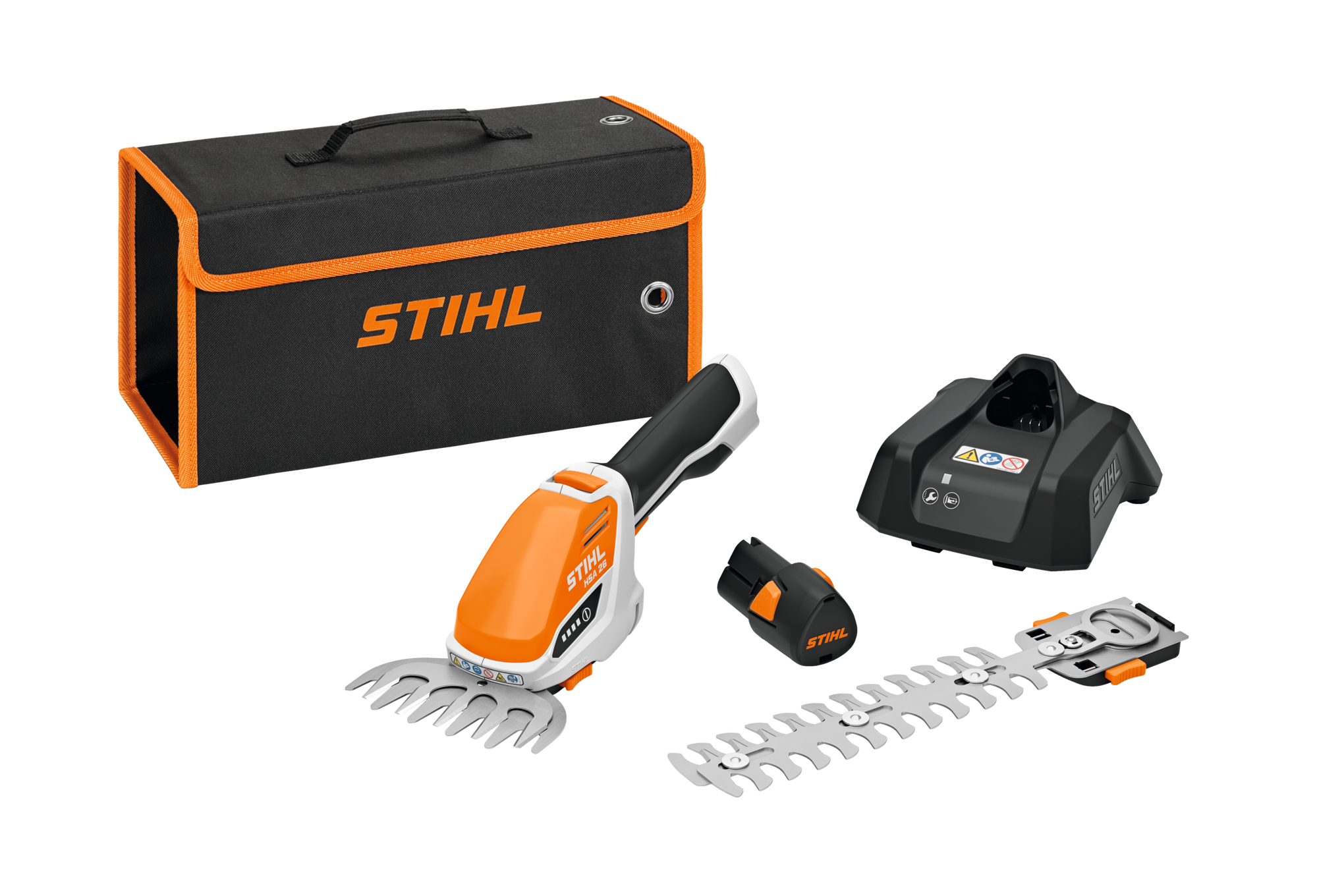 Könnyű sövénynyíró szett gyepszélek és sövények nyírásához. A könnyű és kompakt fogantyús akkumulátoros sövénynyíró kisebb örökzöldek és kislevelű cserjék ápolásához alkalmas. Kiváló vágási kép az optimalizált STIHL késgeometriás sövénynyíró késnek köszönhetően. 12 cm vágásszélességű fűvágó kés (késvédővel) teraszok, virágágyások, kerítések menti területek nyírásához, szerszám nélkül cserélhető késekkel. Az akkumulátor nélkül mindössze 0,8 kg tömegű sövénynyíró a kényelmes használat érdekében ergonomikus, csúszásmentes markolattal rendelkezik. A külön megvásárolható tartozékként kapható teleszkópos szár lehetővé teszi a STIHL HSA 26 függőleges helyzetben történő használatát. LED-es akkumulátortöltöttség jelző.