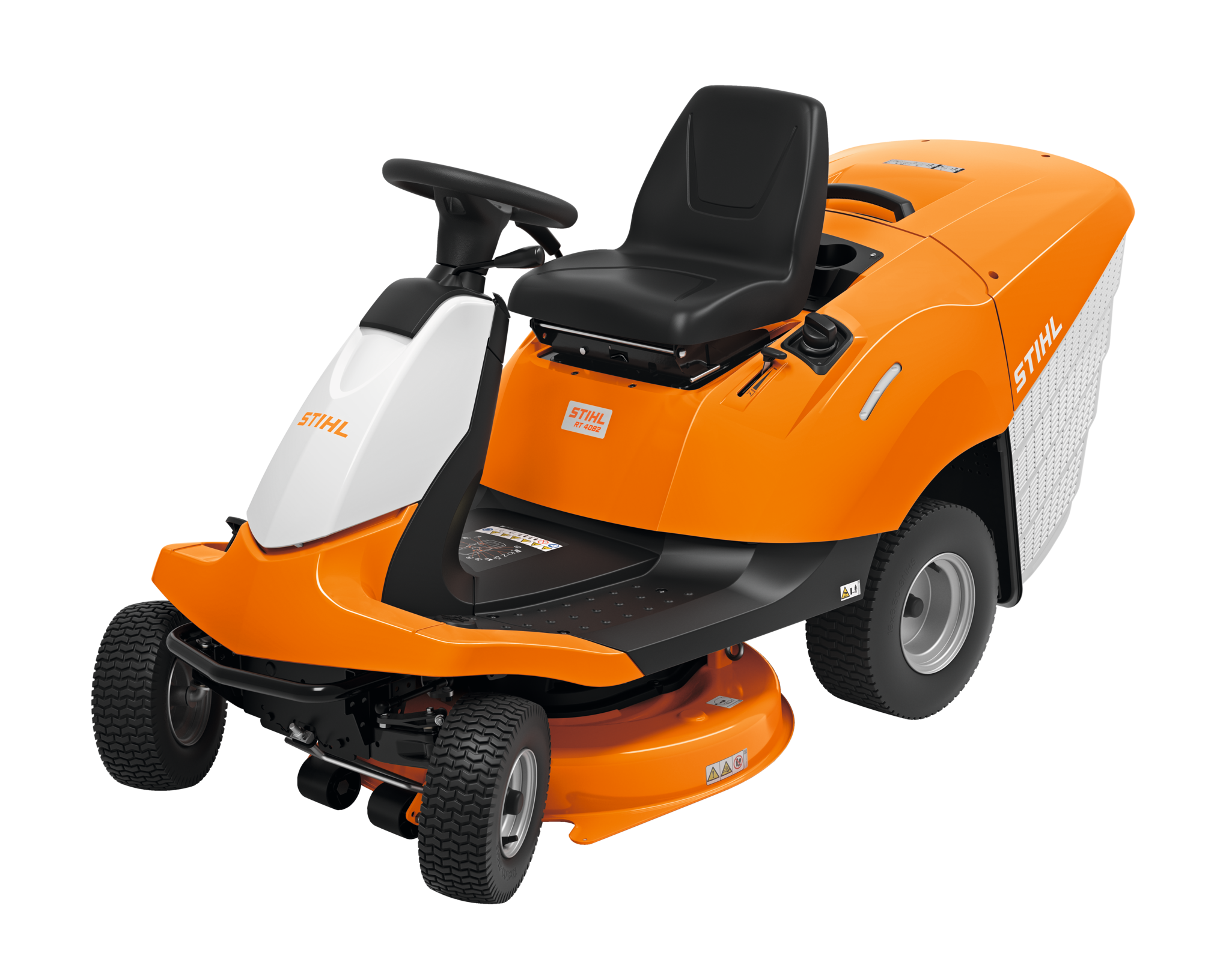 A STIHL RT 4082 könnyen manőverezhető fűnyíró traktor akár 4000 m²-es füves területek nyírására is alkalmas. Kis fordulási körével a fűnyíró traktor gyorsan és kényelmesen manőverezhető a fákkal vagy bokrokkal rendelkező területeken is. A kényelmes, könnyen állítható vezetőülés kényelmes munkakörülményeket tesz lehetővé, magassága szerszám nélkül, szinte minden testmagassághoz beállítható. Munkaszélessége 80 cm, a precíz szegélynyírás érdekében a vágóasztal speciális fülei a szélső fűszálakat is a kések alá hajtják. A 250 literes, ívelt formájú fűgyűjtő kosár egy mozdulattal, a vezetőülésben ülve, kényelmesen kiüríthető. Az előre- és hátramenet kapcsolása a kormány melletti karral történik, így csak egy gázpedált kell kezelni. A külön fékpedál megnyomásával a traktor azonnal leáll. Elektromágneses késkuplunggal a kések megóvásához. A nyírószerkezet kései a műszerfalon elhelyezett kapcsolóval könnyedén ki- és bekapcsolhatók. Az átgondolt formatervének köszönhetően a fűnyírótraktor és a fűgyűjtő kosár tisztítása is rendkívül egyszerű. A vágási magasság 35-90 mm között állítható.